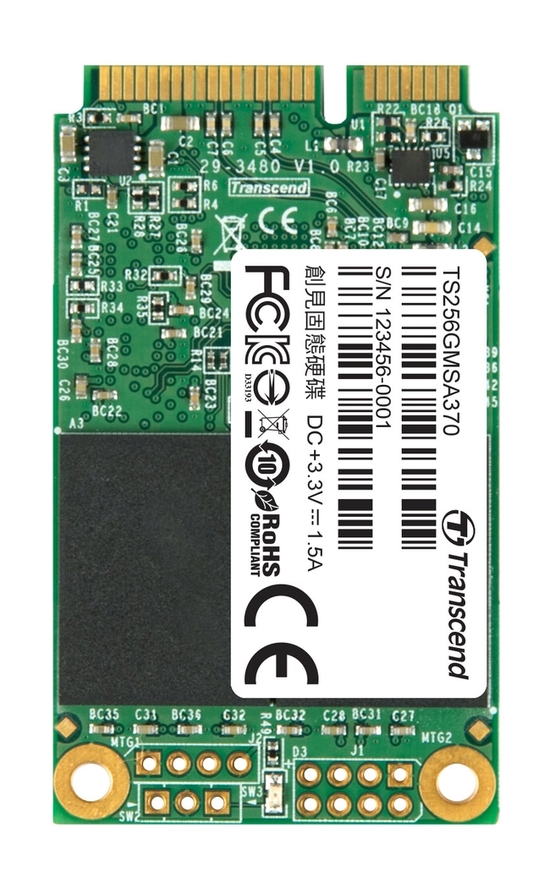 Supporting the next-generation Serial ATA interface and built around a powerful controller, Transcend's SATA III 6Gb/s MSA370 mSATA SSDs deliver blazing fast performance and long-term reliability. The compact mSATA form factor makes it perfect for use in space-restricted portable devices such as Ultrabooks, tablet PCs, and slim servers. Features •MLC flash-based performance and reliability •Supports Intel® Smart Response Technology (ISRT) • DDR3 DRAM cache •Maximizes notebook battery life when not in use thanks to full support of SATA Device Sleep Mode (DevSleep) •S.M.A.R.T., TRIM and NCQ support to maintain a healthy, efficient SSD • Built-in wear-leveling algorithm ensures highly reliable of data transfer Intel Smart Response Technology Transcend's SATA III 6Gb/s MSA370 mSATA SSD supports Intel® Smart Response Technology (ISRT), which allows you to configure your computer system with an SSD used as cache memory between the hard disk drive and system memory. This provides the advantage of having a hard disk drive for maximum storage capacity while delivering an SSD-like overall system performance experience. ISRT works by monitoring which programs and files you access most frequently and stores them on the SSD. As a result, application launch speed and overall system responsiveness are significantly improved, while the large capacity of the hard drive is free to store all your other programs and files. In this configuration, only one drive letter is displayed; no additional drive letter is required for the SSD used as cache. Capacity 16GB, 32GB, 64GB, 128GB, 256GB, 512GB Dimensions (max.) 50.8mm x 29.85mm x 4.0mm (1.18" x 2" x 0.14") Weight 8g (0.28oz) Storage Media MLC NAND Flash memory Operating Voltage DC 3.3V±5% Operating Temperature 0°C(32°F) to 70°C(158°F) Certificates CE, FCC, BSMI Warranty Three-year Limited Warranty* (The 3 years warranty does not apply when SSD Scope's wear-out indicator shows 0% within 3 years) *Please access here for more information about Transcend Warranty Policy. *Note Speed may vary due to host hardware, software and usage. System Requirements Desktop or notebook computer with a mini-PCIe (mSATA) interface (A SATA 6Gb/s port is needed for best performance) Required OS: •Windows XP/Vista/7/8 • Linux Kernel 2.6.31, or later |