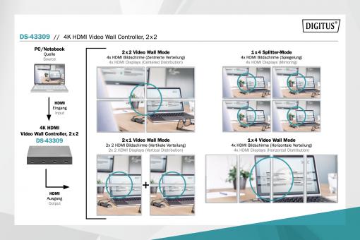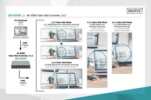 Zkombinujte čtyři propojené Full HD displeje (HDMI®) do videostěny – možné různé formace displejů Zkombinujte až 4 displeje do videostěny podle vašeho výběru Ideální pro všechny druhy vizualizací pro veletrhy nebo reklamu Funguje s jakýmkoli displejem HDMI® Full HD Podporuje různé sestavy displejů (horizontální, vertikální nebo kombinované) Podporuje režim rozdělovačů (4 displeje se stejným obsahem) Podporuje vstupní signál HDMI až 4K / 60 Hz ® (YUV 4:4:4) Podporuje výstupní signály až 4 x Full HD / 60 Hz (1920 x 1080p) Celková šířka pásma 18 Gb/s pro plynulé přehrávání ve vynikající kvalitě Na displeji (OSD) pro zobrazení režimu a portu Vysoce kvalitní měřítko obrazu Popis S řadičem videostěny DIGITUS® 2x2 můžete transformovat celkem 4 televizory nebo monitory pomocí HDMI® do velkoformátové videostěny. Ovladač umožňuje distribuovat signál 4K s vysokým rozlišením na 4 displejích s rozlišením Full HD a vytvořit tak velký obraz. Můžete být tak kreativní, jak chcete: nastavit klasickou stěnu monitoru 2x2 nebo uspořádat 2 až 4 monitory vodorovně nebo vertikálně a zkombinovat je tak, aby vytvořily videostěnu. Stisknutím tlačítka na zařízení nebo dálkového ovládání, které je součástí dodávky, můžete přepínat mezi různými režimy. Zařízení také obsahuje funkci rozdělovače, která umožňuje zobrazit stejný obrázek na všech monitorech. S tímto profesionálním nástrojem jste ideálně vybaveni pro zobrazení vizualizací všeho druhu pro veletrhy, reklamu nebo výlohy s vysokou mírou flexibility. Technické detaily Rozlišení HDMI® Vstup: 1 x 4K / 60 Hz (3840 x 2160p / YUV 4:4:4) Rozlišení HDMI® Výstupy: 4 x Full HD / 60 Hz (1920 x 1080p) Celková šířka pásma HDMI®: 18 Gb/s (všechny kanály) Další podporovaná vstupní rozlišení: 480i, 480p,576p,576i,720p,1080i, 1080p(50/60Hz),4K@24/25/30Hz,4k@50/60Hz Podporuje sestavy displejů: 2x2, 1x2, 2x1, 1x3, 3x1, 1x4, 4x1 (vertikální x horizontální) Podporuje režim rozdělovačů displejů: 1x4 Provozní teplota: 0 °C ~ 70 °C Provozní vlhkost: 5% - 90% RH (nekondenzující) Napájecí adaptér: 100 - 240 V AC / 0,65 A Napájecí zařízení: 12 V / 2 A Délka kabelu: cca 1,2 m Materiál pouzdra: Kov Rozměry: W 11,5 x D 11,1 x H 2,7 cm Hmotnost: 395 g Barva: Černá Hdtv rozlišení max.: 3840 x 2160 Pixel, 60Hz KVM: ne PoE (Napájení přes Ethernet): ne Porty pro připojení videa: HDMI Obsah balíčku 1 x 4K HDMI® video nástěnný ovladač, 2 x 2 1 x Napájecí adaptér 1 x Dálkové ovládání 1 x Uživatelská příručka |