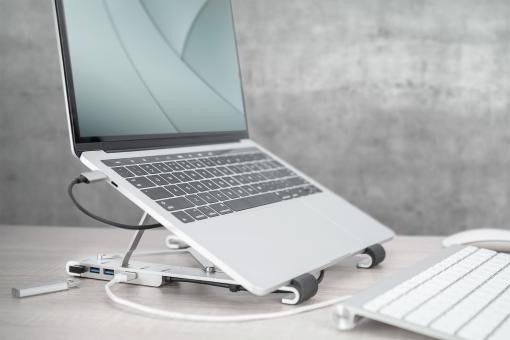 DIGITUS skládací stojan na notebook s integrovaným 5 Portovým USB 3.0 rozbočovačem, PD Nabíjení, vstup USB-C , stříbrný