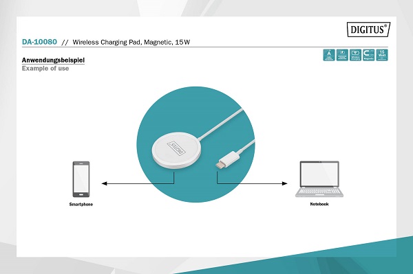 Magnetická bezdrátová 15W nabíjecí podložka s integrovaným nabíjecím kabelem USB-C o délce 100 cm Kompatibilní s iPhone® 12/13 Indukční nabíjecí technologie pro bezdrátové nabíjení kompatibilních smartphonů Magnetický kroužek je optimalizován pro nejnovější modely Apple iPhone® a funkci nabíjení lze použít s jakýmkoli smartphonem, který umožňuje indukční nabíjení. Připojovací kabel s konektorem USB-C Kompaktní a robustní pouzdro z hliníku/ABS s elegantním vzhledem Napájecí adaptér není součástí dodávky Magnetická nabíjecí podložka od DIGITUS® se automaticky zachytí v optimální nabíjecí poloze iPhonu®, aby bylo zaručeno účinné nabíjení. Indukční nabíječka obsahuje integrovaný nabíjecí kabel USB-C o délce 1,0 m a funguje se všemi produkty kompatibilními s Apple MagSafe®. Technické údaje Nabíjecí podložka s výkonem 15W Kompatibilní se smartphony Apple iPhone® 12/13 Vstupní napětí: 5V/2A, 9V/2A, 12V/1,5A Výkon bezdrátového portu: 5W / 7,5W / 10W / 15W Přepěťová ochrana / ochrana proti nadměrnému proudu / ochrana proti zkratu 1,0m propojovací kabel s USB-C konektorem Pouzdro: Ohnivzdorný materiál Rozměry: D: 56 x V: 5,8 mm Barva bílá Hmotnost: 60g Styl: Nabíječka/Napájecí zdroj Obsah balení 1x Bezdrátová nabíjecí podložka, magnetická QIG (Příručka pro rychlou instalaci) |