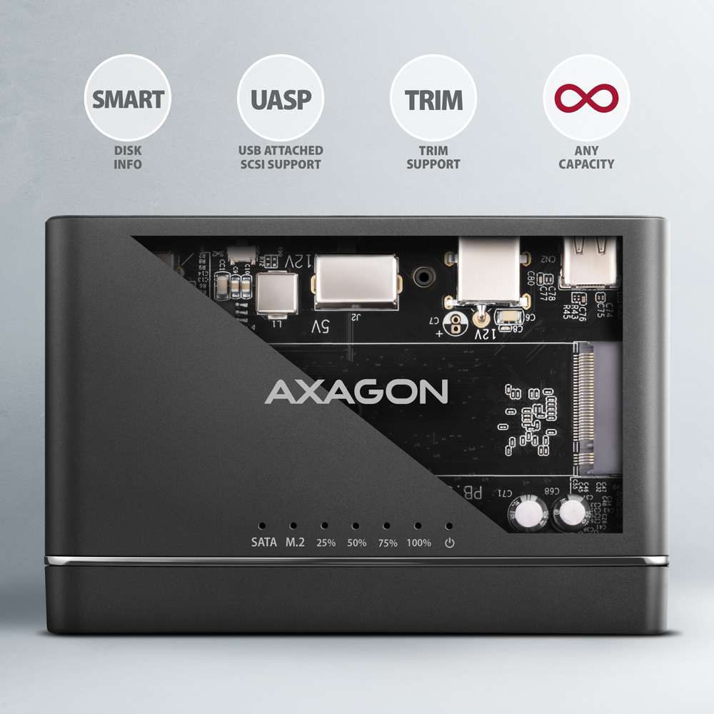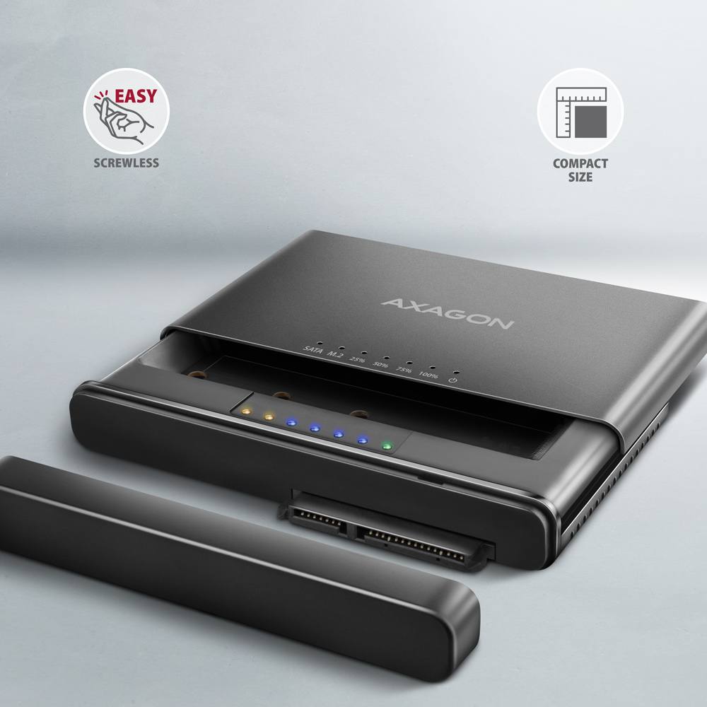 USB 3.2 Gen 2 adaptér pro připojení NVMe M.2 SSD a SATA 2.5"/3.5" disků s funkcí klonování.