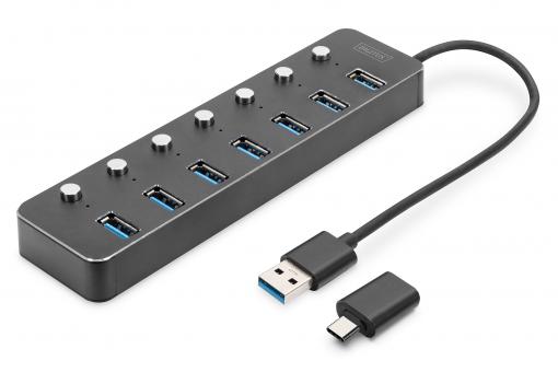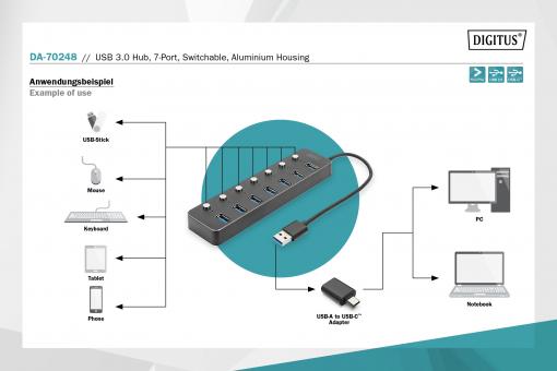 Rozbočovač USB 3.0, 7 portů, přepínač Hliníkové pouzdro, včetně zdroje 5V/2A