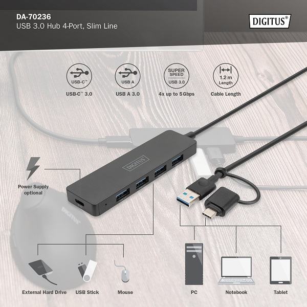 Rozšiřuje váš notebook s připojením USB-C nebo USB A o 4 další superrychlé porty USB. Navíc 4x USB A 3.0 s rychlostí až 5Gb/s k portu USB A nebo USB-C. HUB USB-C 3.0 a USB A 3.0, kombinace USB-A a USB-C je navržena tak, aby byl HUB kompatibilní s širokou škálou notebooků. Rozbočovač USB poskytuje až čtyři další možnosti připojení externích pevných disků, SSD nebo jiných zařízení USB v počítači, notebooku nebo tabletu. Díky standardu Super-Speed USB 3.0 je možný rychlý přenos dat rychlostí až 5 Gb/s - díky zpětné kompatibilitě jsou podporovány také rozhraní USB 2.0 a USB 1.1. Integrované připojení USB-C umožňuje poskytnout USB HUBu další napájení (nabíjecí kabel/adaptér není součástí dodávky). Pro optimální umístění rozbočovače USB na stole nebo ve skříňce s televizorem má zařízení pevný, 120 cm dlouhý připojovací kabel. Kompatibilní s mnoha operačními systémy, např. macOS, Windows a Google Chrome OS. Rozbočovač DIGITUS USB 3.0 Hub Slim Line je ideálním rozšířením pro každé pracoviště. Až čtyři zařízení USB lze připojit a používat současně, což usnadňuje použití více vstupních zařízení nebo přenosných úložných zařízení. Díky technologii USB 3.0 dosahují datové přenosy rychlosti až 5 Gbps a zajišťují nejrychlejší výměnu dat. Díky tenkému designu je 4portový hub ideálním společníkem na cestách, ale je také nepostradatelný v domácnosti a kanceláři. Pomocí 1,2m kabelu můžete upravit délku tak, aby dokonale odpovídala vašemu notebooku nebo pracovní stanici. TECHNICKÉ ÚDAJE Čtyři porty USB 3.0 s rychlostí až 5 Gb/s Podporuje superrychlostní (5 Gbps), vysokorychlostní (480 Mbps) a plnou rychlost (12 Mbps) datové přenosy Dolů kompatibilní s USB 2.0 a 1.1 Délka kabelu: 1,2m Hmotnost: 42,3 g Barva: černá Rozměry: d 10,5 x š 3,0 x v 1,0 cm Provozní teplota: 0°C - 40°C (35°F až 100°F) Konektory USB-A (3.0): 4 USB-C konektory: 1 OBSAH BALENÍ 1x USB HUB 1x adaptér USB A na USB-C 1x Návod k použití |