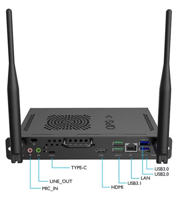 CPU Intel® 12 Gen i7 1255U Graphics Intel® Iris® Xe Graphics Memory 8 GB DDR4 (2 x 4 GB) Storage 256 GB Dimensions (W × H × D) 180 × 30 × 119 mm (7.09 × 1.18 × 4.69 in) Box Size (L * W * H) 254 x 196 x 77 mm (10 x 7.72 x 3.03 inch) Gross Weight 1.23 kg (2.71 lbs) Connectivity Output HDMI 2.0 (4K UHD @ 60Hz, 3.5 mm audio Input 3.5 mm audio USB USB 3.1 Type-C, 2 × USB 3.1, USB 3.0, USB 2.0 Ethernet 1GbE Wireless Wi-Fi 6, IEEE 802.11 a/n/ac/ax 5 GHz, IEEE 802.11 b/g/n/ax 2.4 GHz Package content Included Intel OPS slot-in computer, 2 × Wi-Fi antennas Compatibility BenQ Boards CP6501K, CP8601K, RP6503, RP7503, RP8603, RP6502, RP7502, RP8602 RP6501K, RP7501K, RP8601K RM6503, RM7503, RM8603 RM5502K, RM6502K, RM7502K, RM8602K RM5501K, RM6501K, RM7501K, RM8601K RM6502S, RM7502S, RM8602S RE6501, RE7501, RE8601, RE9801 IL4301, IL5501 Smart Displays CS6501, CS7501, CS8601 ST4302, ST5502, ST6502, ST7502, ST8602 ST6502S, ST7502S, ST8602S |