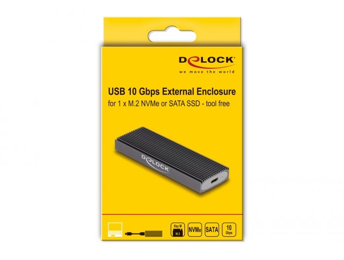Tento kryt značky Delock umožňuje instalaci M.2 PCIe NVMe SSD nebo SATA M.2 SSD ve formátu 2280, 2260, 2242 a 2230. Lze jej připojit kabelem USB k PC nebo k notebooku. Robustní kovový kryt s chladicími lamelami zajišťuje optimální teplotu paměti. Kombo pouzdro Velkou výhodou tohoto krytu Delock M.2 je, že do pouzdra lze vložit jak disky SATA, tak i PCIe (NVMe) M.2 SSD. Paměť bude automaticky rozpoznána čipovou sadou a pak ji bude lze používat. Instalace SSD bez nástrojů Speciální funkcí tohoto pouzdra je, že k instalaci SSD M.2 není potřeba žádných nástrojů. Vnitřní díl lze vytáhnout stlačením tlačítka, načež bude SSD vložen do slotu a přitlačen gumovou spojkou k desce. Specifikace Konektor: externí: 1 x USB 10 Gbps USB Type-C™ samice interní: 1 x M.2 klíč M slot Chipset: Realtek RTL9210B Podporuje M.2 moduly ve formátu 2280, 2260, 2242 a 2230 s klíčem M nebo klíčem B+M na základě SATA nebo PCIe (NVMe) Maximální výška komponentů na modulu: 1,5 mm je podporována aplikace oboustraných modulů Podporuje NVM Express (NVMe) Možnost bootování Rychlost přenosu dat 10 Gbps LED indikující napájení a přístup Kovová skříňka Rozměry (DxŠxV): cca. 110 x 38 x 13 mm Hot Plug, Plug & Play Systémové požadavky Android 10.0 nebo vyšší Chrome OS Linux Kernel 5.11 nebo vyšší Mac OS 11.2.3 nebo vyšší Windows 10/10-64/11 iPad Air (4-mé generace) nebo vyšší iPad Pro (3-mé generace) nebo vyšší Surface Pro 7 PC nebo notebook s volným USB Type-C™ portem PC nebo notebook s volným portem Thunderbolt™ 3 Obsah balení • Externí pouzdro M.2 • Kabel USB-C™ samec na USB-C™ samec (s adaptérem na USB Typu-A samec), délka cca. 45 cm • 1 x tepelně vodivá podložka • 1 x tepelně vodivá destička • 2 x gumová špička • Uživatelská příručka Balení Kartonová krabice |