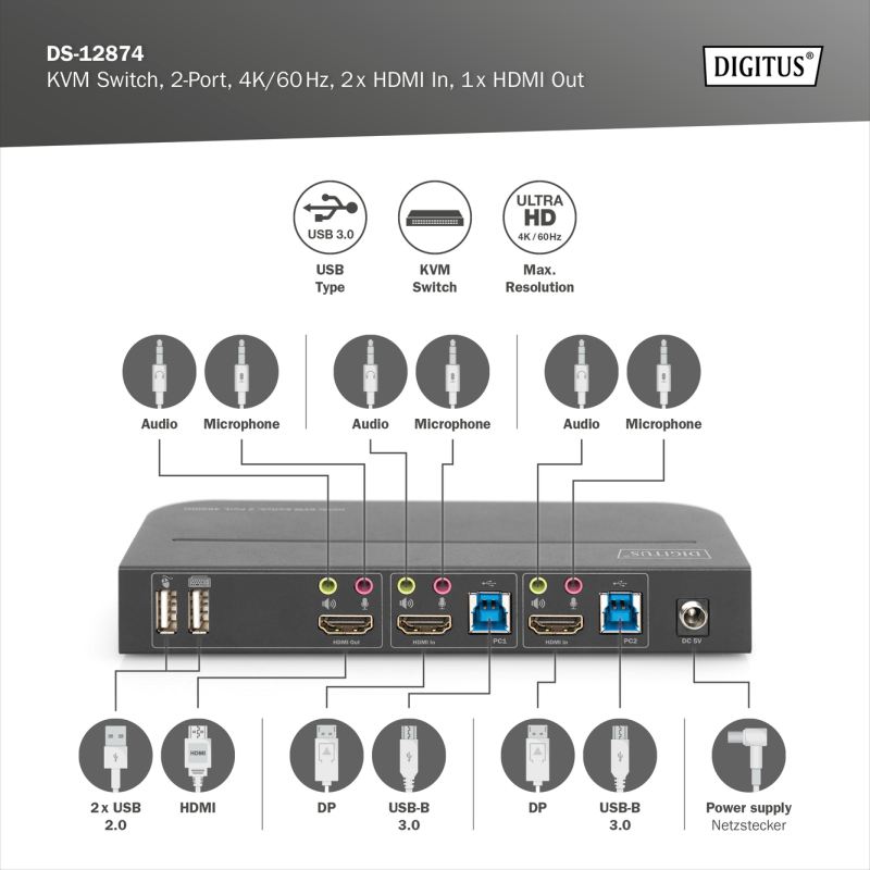 DIGITUS® 2-Port KVM Switch je vysoce výkonný HDMI-KVM přepínač. Směruje video s vysokým rozlišením (ve více rozlišeních až do 4kx2k@60Hz) a zvuk z kteréhokoli z několika zdrojů do zobrazovacích jednotek. Tento přepínač HDMI-KVM má nejen funkci přepínání stisknutím tlačítka, ale má také inteligentní funkci a také funkci připojitelnou za provozu.