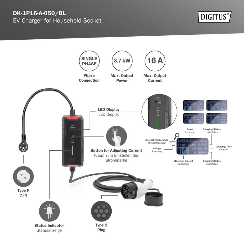 Nabíječka EV, 5m, 230 V, Typ F 7/4 až EV Typ 2, Nastavitelný nabíjecí výkon:1,8; 2,3; 2,8; 3,7 kW