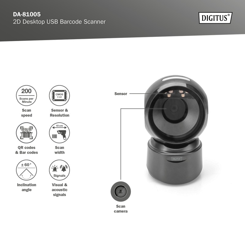 Všesměrový snímač čárových kódů se skenovacím výkonem až 200 skenů/s a elegantním designem pro spolehlivé použití v pokladnách lékáren, supermarketů a dalších maloobchodních zařízení Přesné skenování 1D a 2D čárových kódů s vysokým rozlišením (čárové kódy / QR kódy) 200 skenů za sekundu, obousměrné pro spolehlivé rozpoznání, úspěšné rozpoznání kódu je potvrzeno světelným a zvukovým signálem. Čte čárové kódy na obrazovkách - ideální pro platbu přes smartphone / QR kód (např. elektronická peněženka). Ideální pro maloobchod, logistiku a obchod všeho druhu Anti Inference: Externí světelné zdroje nemají žádný vliv na skenování. Integrovaný infračervený senzor automaticky aktivuje skener, když je čárový kód přidržen v oblasti skenování. Kompaktní design s otočnou hlavou, vytváří prostor na pokladním stole POPIS 2D snímač čárových kódů od společnosti DIGITUS® s vysokým rozlišením a snímačem CMOS nezávislým na pohybu umožňuje rychlé a přesné snímání statických i nestatických čárových kódů. Vhodné pro pokladní prostory v lékárnách, supermarketech a dalších maloobchodních zařízeních. Detekuje vytištěné QR kódy a QR kódy zobrazené na obrazovkách (např. elektronická peněženka). S 200 skeny za sekundu poskytuje tento obousměrný skener ty nejlepší výsledky. Vhodné pro jednorozměrné a všerozměrné čárové kódy, jako jsou čárové kódy a QR kódy. Skener je také schopen číst QR kódy z displejů, což je ideální pro skenování QR kódů pro mobilní platby. Každé skenování je potvrzeno vizuálními a zvukovými signály, které podporují nejběžnější typy kódování. Velké snímací úhly dále urychlují rozpoznávání čárových kódů. TECHNICKÉ ÚDAJE 2D a 1D skenování – Čárové kódy a QR kódy na papíře nebo displejích Příkon: 5V DC, 235mA Napájení: USB Typ skenování: Snímání obrázku Senzor: CMOS CPU: ARM 32-bit Cortex Rozhraní: USB Spoušť: automatická Chybovost v bitech: 1/5 milionu, 1/20 milionu Rozlišení: 1D: ?4mil, 2D:?10mil Šířka skenování: 10 cm Počet skenů: 200 za sekundu. Hloubka ostrosti: 3,3 mil @ 2 mm-100 mm, 10 mil @ 2 mm-350 m; 15,6 mil @ 5 mm - 600 mm; 35 mil @ 10 mm-1000 mm Úhel snímání: Úhel otáčení ±360°, úhel sklonu ± 60°, úhel sklonu ± 60° Dekódování: 1D: Codabar, kód 39, kód 32 Pharmaceutical (PARAF), prokládaný 2 z 5, NEC 2 z 5, kód 93, přímý, 2 z 5 průmyslový, rovný 2 z 5 IATA, Matrix 2 z 5, kód 11, Kód 128, GS1-128, UPC-A, UPC-E,EAN/JAN-8, EAN/JAN-13, MSI, GS1 DataBar Omn Dekódování 2-D: DOT Code, Codeblock A, Codeblock F, PDF417, Micro PDF417, GS1 Composite Codes, QR Code, Data Matrix, MaxiCode, Aztec, HANXIN Kompatibilní s Windows / Android / iOS / Mac / Linux OBSAH BALENÍ 1x 2D čtečka čárových kódů s USB kabelem 1,4m 1x QIG |