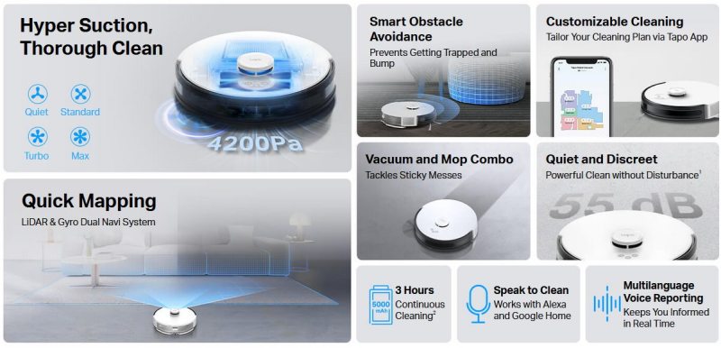 Robotický vysavač TP-Link Tapo RV30 s integrovaným mopem vám umožní rychle a bez námahy uklidit celou vaši domácnost. Elektronické čerpadlo pro mokrý úklid se přizpůsobí všem typům podlah. Hyper sání vysavače vás zbaví veškerých nečistot včetně prachu skrytého v kobercích.