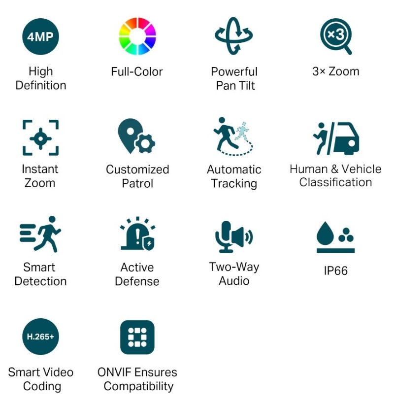 Klíčové vlastnosti rozlišení 4MP(2560 X 1440) 3x Zoom Instant Zoom:Přibližování probíhá okamžitě, bez zpoždění a přetahování obrazu. Rozlišení lidí a vozidel: Rozlišuje lidi a vozidla od ostatních objektů, takže dostáváte přesnější oznámení o událostech. Inteligentní Detekce: Přijímejte oznámení a kontrolujte kanály, když někdo překročí hranici, vstoupí do nastavené oblasti, překáží kameře, odstraní/opustí předměty nebo vstoupí/vyjde z určité oblasti. Výkonná funkce otáčení a naklápění: Přizpůsobené trasy střežení a automatické sledování poskytují inteligentnější možnosti monitorování klíčových oblastí a zvyšují bezpečnost vašeho majetku. Aktivní obrana: Okamžitě odraďte možné vetřelce pomocí sirény a světel v případě neobvyklých situací. Obousměrný zvuk: Díky podpoře hlasového interkomu můžete vést obousměrnou konverzaci a zároveň sledovat svůj kanál odkudkoli. Stupeň krytí IP66: Spolehlivé krytí IP66 pro stabilní venkovní provoz. Slot na microSD kartu Napájení přes 12V DC konektor nebo PoE 802.3af/at Technické parametry Kamera WDR:Digitální Zoom (optický):3x Typ objektivu:Varifokální - motorický Přísvit:IR, Bílé světlo Dosah přísvitu [m]:30 Pozorovací úhel [°]:84 Režim den/noc:Barevný Citlivost senzoru [Lux]:0,005 Obrazový senzor ["]:1/3 Otáčení a náklon:Otáčení: 0° ~ 332°; Náklon: 0° ~ 120° Obraz Rozlišení:4MP Technologie a vymoženosti:Full-Color Max. rozlišení [pixely]:2560 x 1440 (WQHD) Konektory a rozhraní Slot na paměťové karty:microSD - až 256GB Audio:Mikrofon, Reproduktor Rychlost LAN:(1) 10/100Mbps Napájení Napájení přes PoE:802.3af, 802.3at Typ napájení:DC konektor, PoE Max. spotřeba energie [W]:14 Napájení přes konektor/svorkovnici:12V DC Fyzické charakteristiky Stupeň krytí:IP66 Použití:Venkovní Provozní teplota [°C]:-30 až 60 Hmotnost [g]:430 Šířka [mm]:107 Výška [mm]:139 Hloubka [mm]:136 Barva:Bílá Kompresní standardy Video komprese:H.265 Obecné Kamerová řada:VIGI |