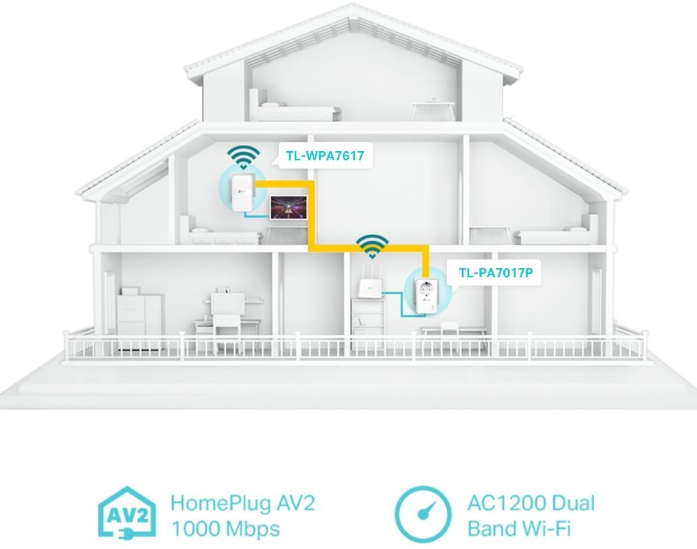 Adaptéry TL-WPA7617 KIT používají pokročilou technologii HomePlug AV2, aby poskytovaly stabilní a vysokorychlostní WiFi síť a současně i kabelové připojení. Přenosová (modulační) rychlost je až 1 000 Mbit/s přes elektrické rozvody na vzdálenost až 300 metrů. Streamujte HD obsah, hrajte online hry a stahujte velké soubory bez přerušování díky spolehlivému připojení k síti Powerline.