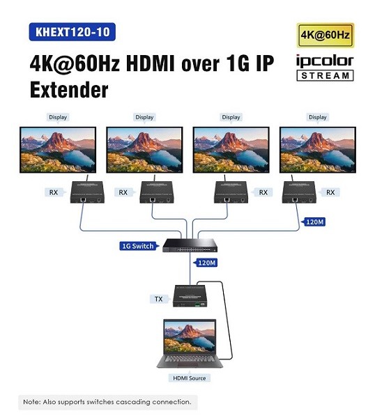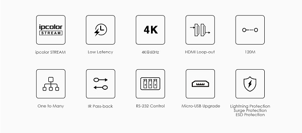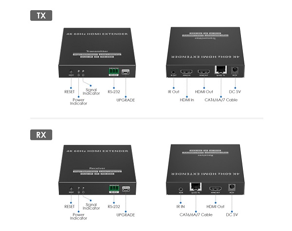 Zařízení umožňuje po jednom síťovém kabelu nebo prostřednictvím LAN sítě přenést nekompreovaný 4K@60Hz HDMI signál až na 120m a současně IR signály. Signál je možné distribuovat pomocí LAN sítě, nejlépe Gigabit sítě a Gigabit switchů jak je znázorněno ve schema zapojení. - Extender umožňuje použití jednoho vysílače a více přijímačů vzájemně propojených pomocí LAN sítě, switchů a routerů (otestováno na 4k@60hz a FULL HD 1080p a 60m kabelu + swich + 2 přijímače) tato počítačová síť musí být vyhrazena pouze pro HDMI extendery, nesmí sdílet další počítače, tiskárny a jiná síťová zařízení. - Extender umožňuje zapojit až 253 přijímačů a spojit přes switche k jednomu vysílači. - Podporuje 4K@60Hz 444 nebo FULL HD 1080p až na 120m při použití kvalitní sítě Cat6/6A/7 - Způsob zapojení: jeden na jeden, jeden na více přijímačů - Podporuje HDMI 2.0 - Podporuje HDCP 2.2 a HDCP 1.4 - Pro rozlišení: 720p@50/60Hz, 1920x1200@60Hz, 2560x1440@60Hz, 2560x1600@60Hz, 1080p@50/60Hz, 3840x2160@24/30/50/60Hz - Podporuje video formát:24bit/Deep color 30bit/ deep color 36bit - Podporuje audio:DTS-Audio/Dolby Digital 5.1/LPCM2.0 - Přenosová rychlost:18Gbps - Extender přenáší HDMI digitální obraz, zvuk. - LAN kabel TIA/EIA568 B - Doporučujeme pro propojení kvalitní LAN kabel Cat6,Cat6A,Cat7 - Vysílač a přijímač jsou napájeny z přiložených napájecích adaptérů 230V/5V 1A - Vysílač a přijímač má praktické tlačítko RESET - Vysílač a přijímač mají signalizační LED, která signalizují, kdy se jednotky spojily a probíhá přenos signálu. - Doporučené vstupní a výstupní HDMI kabely kratší než 5m - IR frekvence: 20kHz - 60kHz - RS232 rychlost (baud rate): default:115200, podporuje: 2400,4800,9600,19200,38400,57600,115200 - Spotřeba menší než 4W - Rozměry vysílače a přijímače:délka:106mm, šířka:103mm, výška:20,6mm - Váha: TX:254g , RX: 242g - Pracovní teplota: -20°C až 60°C - Vlhkost: 0-90% RH (nekondezační) - Odolné kovové pouzdro - Barva černá V balení: 1x Jednotka vysílače 1x Jednotka přijímače 2x IR kabely 1x manuál 2x napájecí adaptér 5V/1A |