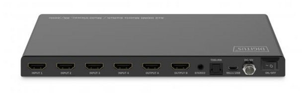 Pohodlně přepínejte mezi až 4 zdroji HDMI a 2 přehrávacími zařízeními a distribuujte svůj mediální obsah nezávisle / Multi-viewer nabízí 6 režimů pro individuální zobrazení zdrojů (rozdělená obrazovka, PIP) Přepínejte až mezi 4 HDMI zdroji a 2 přehrávacími zařízeními pomocí dálkového ovladače, přímo na zařízení nebo přes RS232 ovladač Multi-viewer: 6 režimů pro individuální zobrazení zdrojů na HDMI výstupu A (primární) nebo na HDMI výstupu A a B současně (sekundární) pomocí dálkového ovladače nebo na samotném zařízení Audio extraktor: Toslink / Stereo (3,5 mm) - Oddělení / oddělená reprodukce audio signálu Max. rozlišení: 4K/30 Hz Ovládání RS232 přes micro USB Scaler (přepínač) - Nastavení rozlišení HDMI výstupu (1080p, 1600p, 4K/30Hz) Samostatný vypínač Šířka pásma videa: 10,2 Gbps HDCP 1.4 Rozhraní HDMI 1.4 Popis Maticový přepínač HDMI DIGITUS® 4x2 / Quad Multi-Viewer vám umožní pohodlně přepínat mezi až 4 zdroji HDMI a 2 přehrávacími zařízeními a nezávisle distribuovat váš mediální obsah. Přepínejte pohodlně mezi zdroji signálu pomocí dálkového ovladače, přímo na zařízení nebo pomocí ovládání RS232. Funkce multi-viewer nabízí 6 režimů pro individuální zobrazení zdrojů (split-screen, PIP) na výstupu A nebo paralelně na A & B. Audio signály lze také oddělit a odděleně reprodukovat přes Toslink nebo 3,5 mm stereo připojení. Podporuje rozlišení až 4K/30Hz. Rozlišení výstupu HDMI lze individuálně upravit pomocí scaleru. Technické detaily Přepínejte až mezi 4 HDMI zdroji a 2 přehrávacími zařízeními pomocí dálkového ovladače, přímo na zařízení nebo přes RS232 ovladač Multi-viewer: 6 režimů pro individuální zobrazení zdrojů na HDMI výstupu A (primární) nebo na HDMI výstupu A a B současně (sekundární) pomocí dálkového ovladače nebo na samotném zařízení Audio extraktor: Toslink / Stereo (3,5 mm) - Oddělení / oddělená reprodukce audio signálu Max. rozlišení: 4K/30 Hz Ovládání RS232 přes micro USB Scaler (přepínač) - Nastavení rozlišení HDMI výstupu (1080p, 1600p, 4K/30Hz) Samostatný vypínač Šířka pásma videa: 10,2 Gbps HDCP 1.4 Rozhraní HDMI 1.4 Konexe: 4x HDMI vstup (4K/30Hz) 2x HDMI výstup (4K/30Hz) 1x Toslink 1x 3,5 mm audio 1x Micro USB vstup - RS232 ovládání / servis, aktualizace vzdálené údržby 1x DC jack se šroubovacím konektorem 5V/1A (napájení) - Připojení napájecího adaptéru 9x stavové LED diody 1 x IR přijímač 5x přepínací spínač 1x vypínač Provozní teplota: 0-70° Spotřeba energie: cca. 5W Pouzdro: kov Rozměry (pouzdro): D 21,4 x Š 9,1 x V 1,85 cm Hmotnost: 450 g Barva: černá HDTV rozlišení max.: 3840 x 2160 pixelů, 30Hz HDTV standard: Ultra HD 4K Počet vstupních portů: 4 Počet výstupních portů: 2 Vstup signálu: HDMI Výstup signálu: HDMI Porty pro připojení videa: HDMI |
