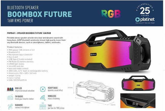 Reproduktor FUTURE je navržen tak, aby poskytoval výjimečně silný a čistý zvuk. Díky výkonu 16W RMS si můžete vychutnat hlasitou a čistou hudbu v jakékoli situaci, bez ohledu na to, zda pořádáte malou párty nebo relaxujete doma.<br> 4"" reproduktory (x2): Tyto dva reproduktory poskytují celé spektrum zvuku, od hlubokých basů po čisté výšky, vyplní každou místnost a dodají vaší hudbě skutečnou sílu.<br> Vestavěná, vysoce výkonná 3,7V 3000mAh baterie zajišťuje dlouhotrvající přehrávání hudby a umožňuje mnoho hodin nepřerušovaného poslechu bez nutnosti častého nabíjení. Ideální pro setkání s přáteli, výlety nebo pikniky.<br> Nejmodernější verze Bluetooth 5.3 zajišťuje stabilní a rychlé spojení s vašimi mobilními zařízeními. Bezdrátově přehrávejte hudbu z telefonu, tabletu nebo notebooku s minimálním zpožděním a maximální kvalitou zvuku.<br> Nemáte po ruce zařízení Bluetooth? Žádný problém. Reproduktor umožňuje přehrávat hudbu přímo z paměťové karty microSD, což vám dává ještě více možností a flexibility.<br> Moderní a univerzální USB Type-C konektor umožňuje rychlé a pohodlné nabíjení reproduktoru a také snadné připojení k různým zařízením.<br> Tradiční AUX vstup umožňuje připojit reproduktor k prakticky libovolnému audio zařízení, jako je MP3 přehrávač, počítač nebo TV, pomocí běžného kabelu.<br> Díky vestavěnému FM rádiu můžete poslouchat své oblíbené rozhlasové stanice bez nutnosti použití dalších zařízení.<br> Reproduktor má vestavěný mikrofonní vstup, díky čemuž je dokonalým nástrojem pro karaoke, konference nebo jakoukoli situaci, kdy potřebujete zesílení hlasu.<br> Funkce TWS umožňuje bezdrátové propojení dvou reproduktorů, čímž vzniká skutečné stereo a ještě silnější zvukový zážitek. Perfektní řešení pro větší prostory a náročnější posluchače.<br> Dynamické, vícebarevné LED podsvícení na celé přední straně reproduktoru dodává moderní a stylový vzhled a vytváří úžasnou atmosféru na každé akci.<br> Rozměry: 20,2 cm x 42 cm x 14,2 cm.<br>" |