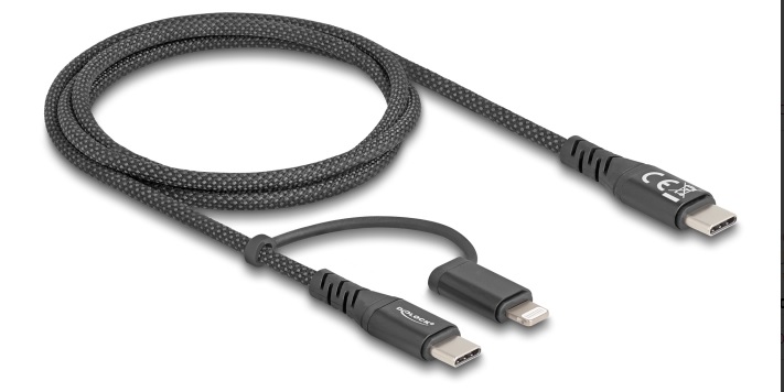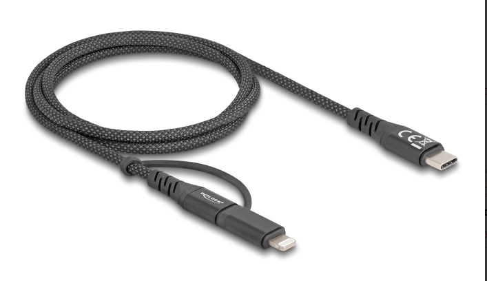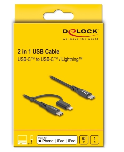 Tento USB kabel 2 v 1, značky Delock, lze používat jako datový a nabíjecí kabel pro chytré telefony a je kompatibilní s iPhone™, iPad™ a iPod™ s osmipinovým konektorem Apple Lightning™. S podporou rychlého nabíjení je možné připojovat zařízení Apple také k nabíječce PD USB Type-C™ pro obzvlášť rychlé nabíjení. Kvalita a výkon Vzhledově je přesvědčivý svým jemným textilním stíněním a svým konektorem v kovovém krytu. Vysoký standard kabelu s 20 AWG navíc podporuje stabilní napájení proudem až 3 A. Certifikace MFi Certifikace MFi a originální konektor Apple C94 zaručují plnou kompatibilitu všech zařízení s konektorem Lightning™. Technické detaily Konektor: 1 x USB 2.0 USB Type-C™ samec 1 x Apple Lightning™ samec + USB 2.0 Type-C™ samec Kabel s certifikací MFi s originálním konektorem Apple C94 Podporuje iPhone 14, iPhone 14 Plus, iPhone 14 Pro, iPhone 14 Pro Max, iPhone SE (2022), iPhone 13, iPhone 13 Pro, iPhone 13 Pro Max, iPhone 13 Mini, iPhone 12 Pro Max, iPhone 12 Pro, iPhone 12, iPhone 12 mini, iPhone SE (2nd generation), iPhone 11 Pro Max, iPhone 11 Pro, iPhone 11, iPhone XS Max, iPhone XS, iPhone XR, iPhone X, iPhone 8 Plus, iPhone 8, iPhone 7 Plus, iPhone 7, iPhone SE, iPhone 6s Plus, iPhone 6s, iPhone 6 Plus, iPhone 6, iPhone 5s, iPad (9th generation) iPad (8th generation), iPad Pro 10.5-inch, iPad Pro 12.9-inch (2nd generation), iPad Pro 9.7-inch, iPad Pro 12.9-inch (1st generation), iPad Air (3rd generation), iPad Air 2, iPad Air, iPad mini (5th generation), iPad mini 4, iPad mini 3, iPad mini 2, iPad (7th generation), iPad (6th generation), iPad (5th generation) Průřez kabelu: 30 AWG datové vodiče 20 AWG napájecí vodiče Průměr kabelu: cca. 4 mm Podpora USB Power Delivery (USB PD 3.0) ve výši až 60 W (jen přes port USB Type-C™) Podporuje funkci rychlého nabíjení (od iPhone 8 / iPad Pro) Maximální výstupní proud: USB Type-C™: 3 A Lightning™: 2,4 A Rychlost přenosu dat 480 Mbps Kabel s textilním stíněním Konektor v kovovém pouzdru Barva: černá Délka: cca. 1 m Obsah balení Kabel USB-C™ na Lightning™ + USB-C™ Balení Kartonová krabice |