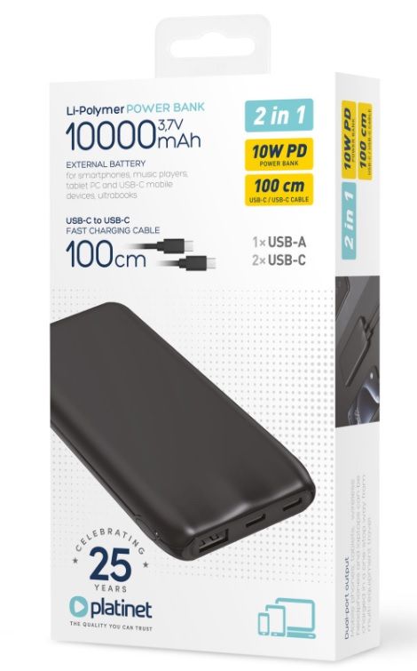 Je vybavena nejpoužívanejšími výstupními porty, včetně jednoho standardního portu USB-A a dvou portů Type-C, z nichž jeden slouží k nabíjení samotné powerbanky. Port USB-A nabízí výstup 5V/2,1A, zatímco port typu C nabízí výstup 5V/2,1A, což vám umožní rychle a efektivně napájet vaše zařízení. Powerbanka je také kompatibilní s technologií rychlého nabíjení 10W PD (Power Delivery)! Vestavěný indikátor vám umožní snadno sledovat stav baterie powerbanky. Přiložený 100 cm kabel Typ-C nabízí pohodlné řešení nabíjení. Díky svým kompaktním rozměrům a rozumné hmotnosti se PMPB1010B snadno přenáší v tašce nebo kapse, což vám umožní mít záložní zdroj energie vždy po ruce. Technická specifikace Kapacita: 10000mAh při 3,7V / 7400mAh při 5V Výstup USB-A: 5V/2,1A Výstup typu C: 5V/2,1A Celkový výkon: 10W PD Rozměry: 137,3 x 68,35 x 15,85 mm Hmotnost: 221 g Konektor typu C 100 cm kabel typu C je součástí dodávky Digitální indikátor 1 port USB-A 2 porty typu C" |