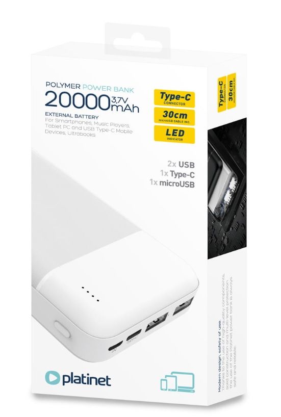KLÍČOVÉ VLASTNOSTI 2 USB konektory MicroUSB a Type-C konektor pro nabíjení powerbanky Klasický, elegantní design VÝHODY POLYMEROVÝCH ČLÁNKŮ Použití polymerních článků umožňuje jejich výrobu téměř v jakémkoli tvaru a tloušťce. Vyznačují se také mírně vyšší hustotou, takže mohou dosahovat vyšších kapacit při stejné velikosti jako lithium-iontové baterie. Proto má powerbanka extrémně kompaktní rozměry při zachování vysoké kapacity. UNIVERZÁLNÍ DESIGN Elegantní minimalistický kryt dobře vypadá a zároveň je odolný proti poškrábání a díky protiskluzové textuře dobře padne do ruky. Důležitá je také nízká hmotnost, díky které si zařízení snadno vezmete s sebou do kapsy, batohu nebo kabelky. Powerbanka je vybavena LED indikátorem, který vás informuje o úrovni nabití baterie. NABÍJEJTE VÍCE ZAŘÍZENÍ NAJEDNOU Powerbanka je vybavena dvěma USB výstupy, díky kterým můžete nabíjet dvě zařízení plnou rychlostí současně. TECHNICKÉ SPECIFIKACE Kapacita: 20000 mAh 74 Wh; Jmenovitá kapacita: 12000mAh (5V / 2,1A); Typ baterie: Li-Pol; MicroUSB vstup: DC 5V-2,1A; Vstup typu C: DC 5V-2,1A; USB výstup (2x): DC 5V-2,1A; Rozměry: 138*65*26mm; Hmotnost: 415g; Bílá barva; Sada obsahuje 30 cm MicroUSB kabel" |