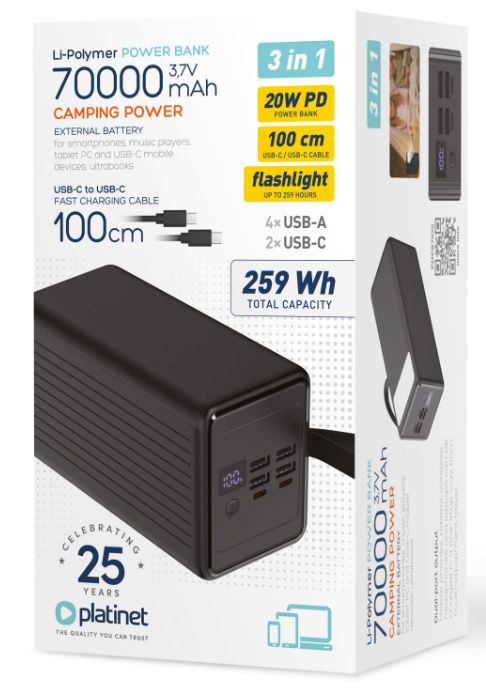 "PMPB7020 je vysokokapacitní power banka, která nabízí rychlé a efektivní napájení elektronických zařízení. S obrovskou kapacitou 70 000 mAh při 3,7 V (ekvivalent 51 800 mAh při 5 V) můžete své smartphony, tablety a další mobilní zařízení dobít několikanásobně, než budete muset powerbanku znovu připravit k použití.