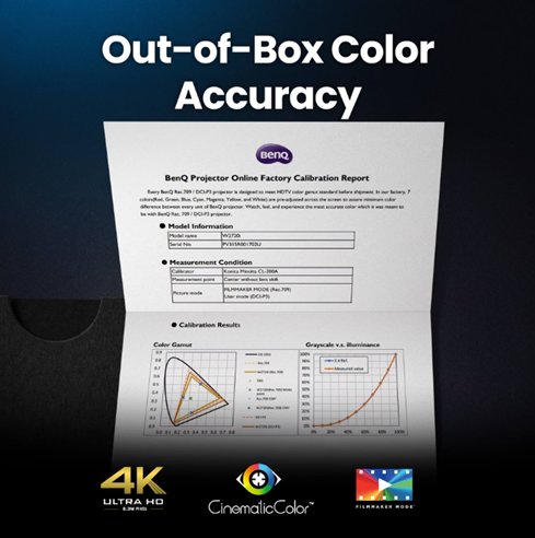 Režim AI Cinema přizpůsobuje barvy na základě scény a okolního osvětlení pro dosažení vynikající kvality obrazu. Dodává se s individuální zprávou o kalibraci z výroby, která zajišťuje 100% přesnost barev Rec.709 s Delta E<3. Je vybaven odolnou LED diodou s životností 30 000 hodin pro trvalé používání. Technické údaje - Zobrazení Jas (ANSI lumenů) 2500 Rozlišení 4K UHD (3840 × 2160) Nativní poměr stran 16 : 9 Kontrastní poměr (FOFO) (se stmíváním světelného zdroje), 2 000 000 : 1 Počet zobrazitelných barev 30 bitů (1,07 miliardy barev) Světelný zdroj 4LED Životnost zdroje světla Dynamic 20000 hrs, a. Normální režim 20 000 hod., b. Režim ECO 30 000 hod. -Optické parametry Projekční poměr 1.0 ~ 1.3 Poměr zoomu 1,3× Objektiv F/# 1.8 - 1.85 mm, f 10.55 (Wide)~13.7(Tele) Posunutí projekce (plná výška) 100% Korekce lichoběžníkového zkreslení 2D, (automaticky) ± 30 stupňů ve svislém směru; ± 30 stupňů ve vodorovném směru Vertikální posun objektivu Vertical ±5% - Obraz Pokrytí DCI-P3 90% Pokrytí Rec. 709 98% Režimy obrazu AI Kino, HDR AI Kino, 3D, Jasný, Kino, REŽIM FILMMAKER MODE, REŽIM FILMMAKER MODE HDR, HDR Kino, HDR10, HDR10+, HLG, ISF Day, ISF Night, Uživatel - Kompatibilita Zpoždění na vstupu 12.8ms (1080P 120Hz), 6.5ms (1080P 240Hz), 17,9 ms (1080P 60 Hz), 17,9 ms (4K 60 Hz) Podporované rozlišení VGA (640 × 480) až 4K UHD (3840 × 2160) Horizontální frekvence 15K÷270KHz Vertikální snímková frekvence 23~240Hz - Konektory Vstup HDMI HDMI-1 (2.1/HDCP2.3) (4K 60Hz/ALLM), HDMI-2 (2.1/HDCP2.3) (4K 60Hz/ALLM/Audio Return+), HDMI-3 (2.1/HDCP2.3)(4K 120Hz *downscaling to 1080p 120Hz), HDMI – interní (2.0b/HDCP2.2) USB Type A USB Type A-2 (2.0/Napájení 1.5A/Čtečka/Upgrade FW), USB Type A-3 (2.0 / napájení 2,5 A) USB Type Mini B USB Type Mini B-1 (servisní) Vstup RS232 (DB, 9 pinů) (x1) Spínací napětí 12 V stejnosm. (3,5mm konektor) (x1) - Zvuk Reproduktor (x2), 5 W Výstup zvuku (3,5mm mini konektor) (x1) Zpětný zvukový kanál HDMI Yes, eARC, Dolby Atmos S/PDIF Vícekanálový, RAW - Prostředí Provozní teplota 0 – 40 °C Napájení 100 až 240 V stř., 50/60 Hz Typická spotřeba energie (110 V) Max 241W, Normal 183W@220V, Eco 133W@220V Spotřeba energie v pohotovostním režimu <0,5 W Hlučnost (typ./eko.) (dB) 28/26 dBA - Příslušenství Adaptér pro Android TV QS02, (standardně) Dálkový ovladač s baterií RCI074 Napájecí kabel (podle regionu) x1 (3,0 m) 3D brýle (volitelně) Krytka objektivu Ano - Rozměry a hmotnost Rozměry (Š × V × H) (mm) 420 x 143 x 305 mm Čistá hmotnost (kg) 6.4 kg +/- 0.1kg - Projekční systém DLP |