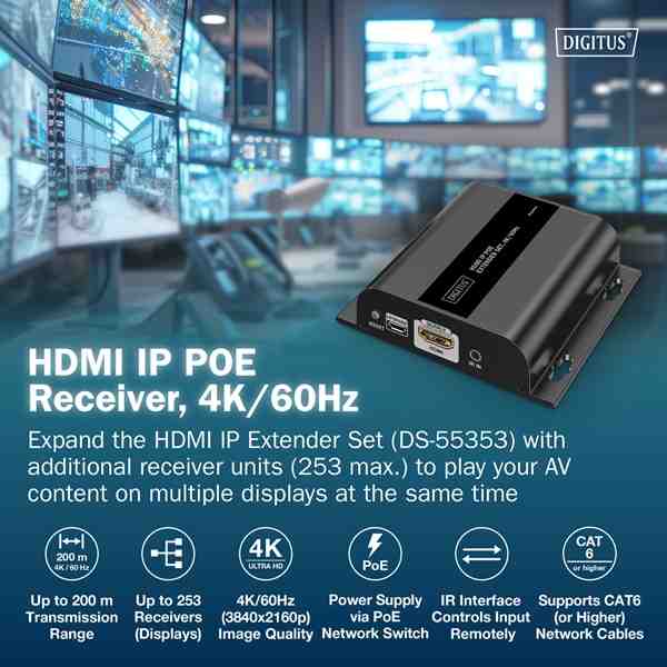 Rozšiřte svůj stávající HDMI IP extender (DS-55353) o další přijímače a přineste svůj AV obsah až na 253 displejů současně – ideální pro digitální signage, konferenční místnosti nebo rozsáhlé prezentace. Díky přenosu signálu založenému na IP přes stávající síťovou infrastrukturu 1G nebo další síťové přepínače 1G můžete distribuovat obsah flexibilně a na neomezené vzdálenosti. Možnost kaskádování zajišťuje maximální škálovatelnost a snadnou integraci do vašeho systému. Přijímač je napájen přes síťový přepínač PoE, není vyžadován žádný externí zdroj napájení, což umožňuje flexibilní instalaci. Užijte si ostrý obraz v rozlišení UHD až 4K/60Hz (4096x2160p) s minimální latencí pouhých 150–220 ms. Integrované IR rozhraní umožňuje dálkové ovládání vstupního zdroje přímo z výstupní obrazovky, což vám umožňuje pohodlně spravovat váš obsah. Pro stabilní a spolehlivé připojení doporučujeme použití síťových kabelů CAT6 nebo vyšší kvality. Přijímač je vhodný i pro montáž na zeď, což umožňuje prostorově úspornou instalaci. Zvyšte efektivitu svého AV řešení s HDMI IP přijímačem 4K/60Hz – pro působivou kvalitu obrazu a maximální flexibilitu.