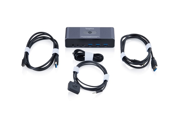 DIGITUS USB-C 3.0 Duální HDMI KVM přepínač, 2portový, 4K60Hz, řada Core Dva počítače, dva monitory – kompletní ovládání pomocí jediné kombinace klávesnice a myši a dokonale ostrý obraz v rozlišení 4K. Přepínač DIGITUS® USB-C 3.0 Duální HDMI KVM z řady Core umožňuje současné ovládání dvou počítačů s rozhraním HDMI™ a duálním výstupem na displej – ideální pro pracovní stanice se dvěma monitory. Přepínání mezi systémy je snadné stisknutím tlačítka nebo pomocí dodaného kabelového dálkového ovladače. Kromě podpory rozlišení až 4K při 60 Hz (YUV 4:4:4), HDR a HDCP nabízí přepínač také rozšířené možnosti připojení USB periferií. Tři porty USB-A 3.0 a jeden port USB-C 3.0 umožňují sdílené používání úložných zařízení, tiskáren nebo vstupních zařízení s datovou rychlostí až 5 Gbit/s. Poznámka: Při použití externích pevných disků nebo SSD disků s vyšší spotřebou energie se doporučuje použít další napájecí adaptér 5V/2A (není součástí balení). Integrovaný 3,5mm audio výstup poskytuje čistý stereo zvuk. Napájení je zajištěno přes USB-C; pro zařízení s vyššími nároky na napájení je k dispozici volitelné připojení externího zdroje napájení.