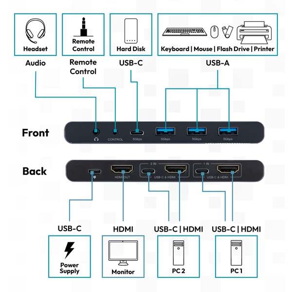 Technické detaily Připojení - Vstupy: 2× vstup HDMI™ (pro dvě zařízení) 2× vstup USB-C 3.0 (pro data/ovládání) Připojení - výstupy: 1× HDMI™ výstup (jeden displej) 3× USB-A 3.0 (až 5 Gb/s) 1× USB-C 3.0 (až 5 Gb/s) 1× 3,5mm audio výstup (stereo) Rozlišení: Až 4K při 60 Hz (YUV 4:4:4) Podpora HDR pro živé barvy Podpora 3D pro kompatibilní obsah HDCP 1.4 / 2.2 pro chráněný obsah Šířka pásma videa: Až 6,0 Gb/s na kanál / celkem 18 Gb/s Stereo výstup přes 3,5mm jack, podporované formáty: LPCM, DTS, Dolby Digital, TrueHD Přepínání tlačítkem na zařízení Ovládání pomocí kabelového dálkového ovladače (1,5 m) s magnetickou základnou Napájení: Přes USB-C (DC 5V), volitelně: napájecí zdroj 5V/2A pro energeticky náročná zařízení USB Pouzdro a rozměry: Materiál: hliníkové pouzdro pro stabilitu a chlazení, rozměry: 135 × 60 × 30 mm, hmotnost: 227 g Obsah balení 1x USB-C 3.0 Dual HDMI™ KVM přepínač, 2portový 2x datový kabel USB-A na USB-C 3.0 (1,5 m) 1x napájecí kabel USB-A na USB-C (1 m) 1x dálkové ovládání s magnetickou základnou (1,5 m) 1x stručný návod k obsluze |