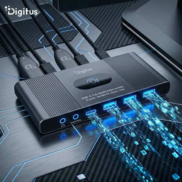 Přepínač DIGITUS® USB-C 3.0 HDMI KVM z řady Core Line umožňuje pohodlné ovládání dvou zařízení s podporou HDMI™ pomocí jedné myši, jedné klávesnice a jednoho monitoru. Díky podpoře rozlišení až 4K@60Hz (YUV 4:4:4), HDCP a HDR poskytuje přepínač brilantní kvalitu obrazu pro náročné aplikace. Stolní počítače, notebooky nebo dokonce herní konzole lze snadno připojit přes vstupy HDMI™ a USB-C 3.0. Kromě toho jsou k dispozici tři porty USB-A 3.0 a jeden port USB-C 3.0 pro sdílení periferií, jako jsou externí pevné disky nebo USB flash disky – s přenosovou rychlostí až 5 Gb/s. Pro provoz s vysoce výkonnými USB disky nebo SSD disky se doporučuje použití externího napájecího zdroje 5V 2A (není součástí dodávky). Přepínání mezi připojenými zařízeními lze provádět buď přímo tlačítkem na zařízení, nebo pomocí dodaného kabelového dálkového ovladače s magnetickou základnou pro flexibilní umístění. Integrovaný 3,5mm audio výstup doplňuje výbavu. Napájení je zajištěno přes USB-C 3.0 - pro výkonná periferie se doporučuje volitelný napájecí adaptér 5V/2A (není součástí balení).